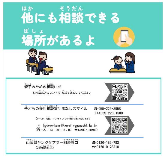 心配(しんぱい)なことや悩(なや)みがあるときはひとりで悩(なや)まないで、あなたの心(こころ)の声(こえ)をきかせてね。