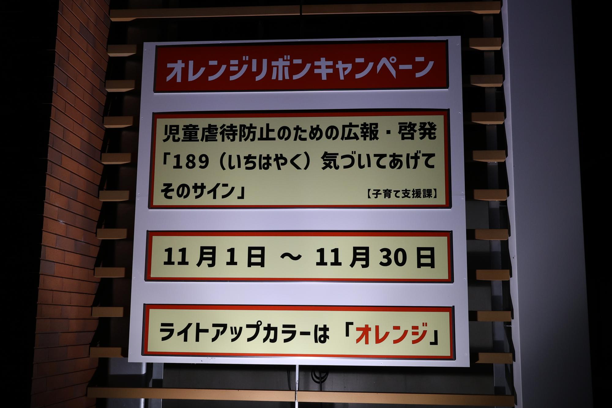 中央市では11月中、他のイベントが重なる日を除き、庁舎を夜間、オレンジ色にライトアップしています。このオレンジの色は虐待を受け里親に養育が託されたことのあるこどもたちによって「子どもたちの明るい未来を示す色」として決められたそうです。オレンジリボンが、たくさんの皆様の心に届き、子どもたち、そして子育て中の親子の心を包み込みますよう、「オレンジリボン運動」に、ぜひご協力をお願いいたします。