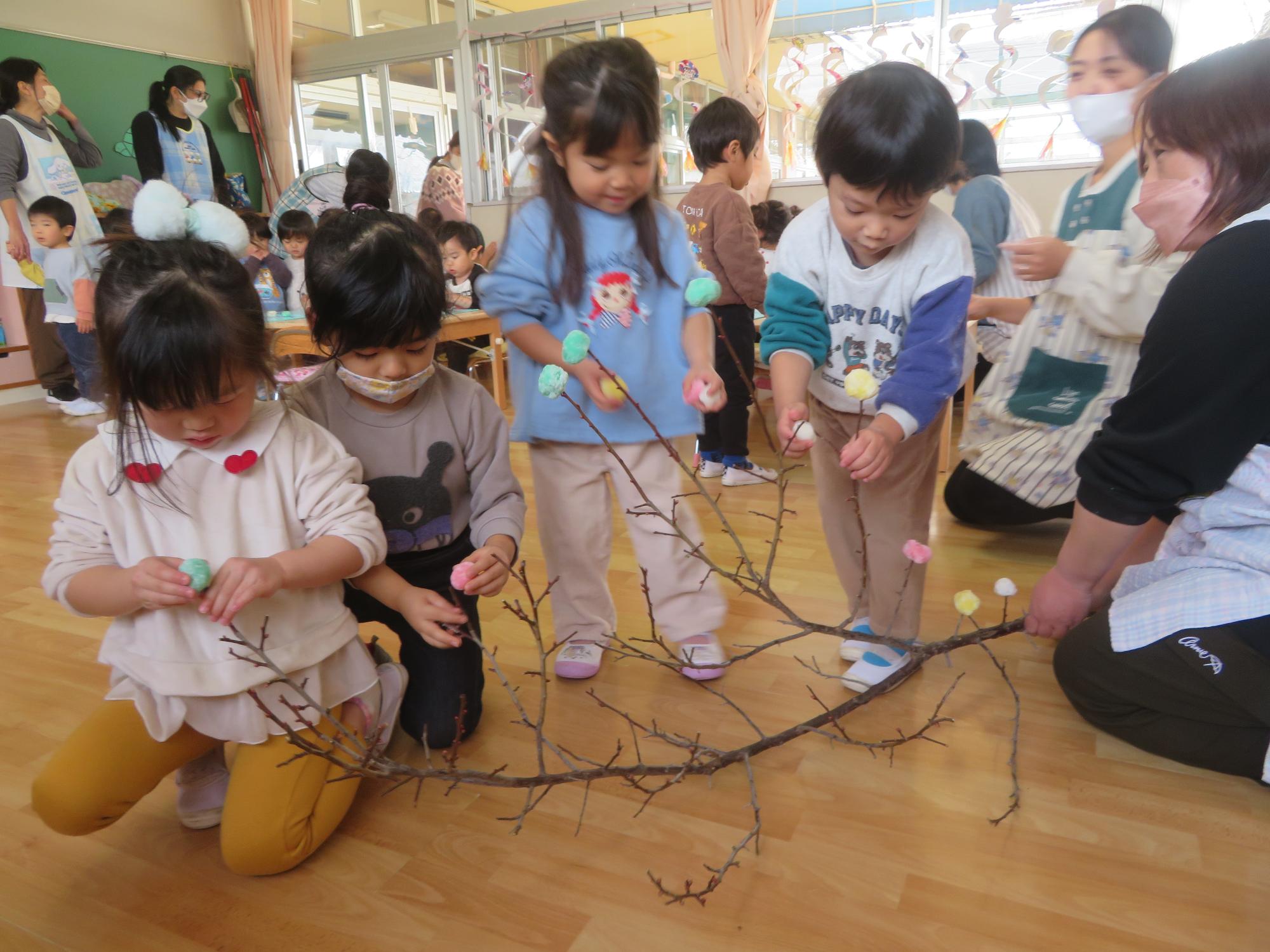 各クラスの前に色とりどりのまゆ玉をつけた木を飾りました。