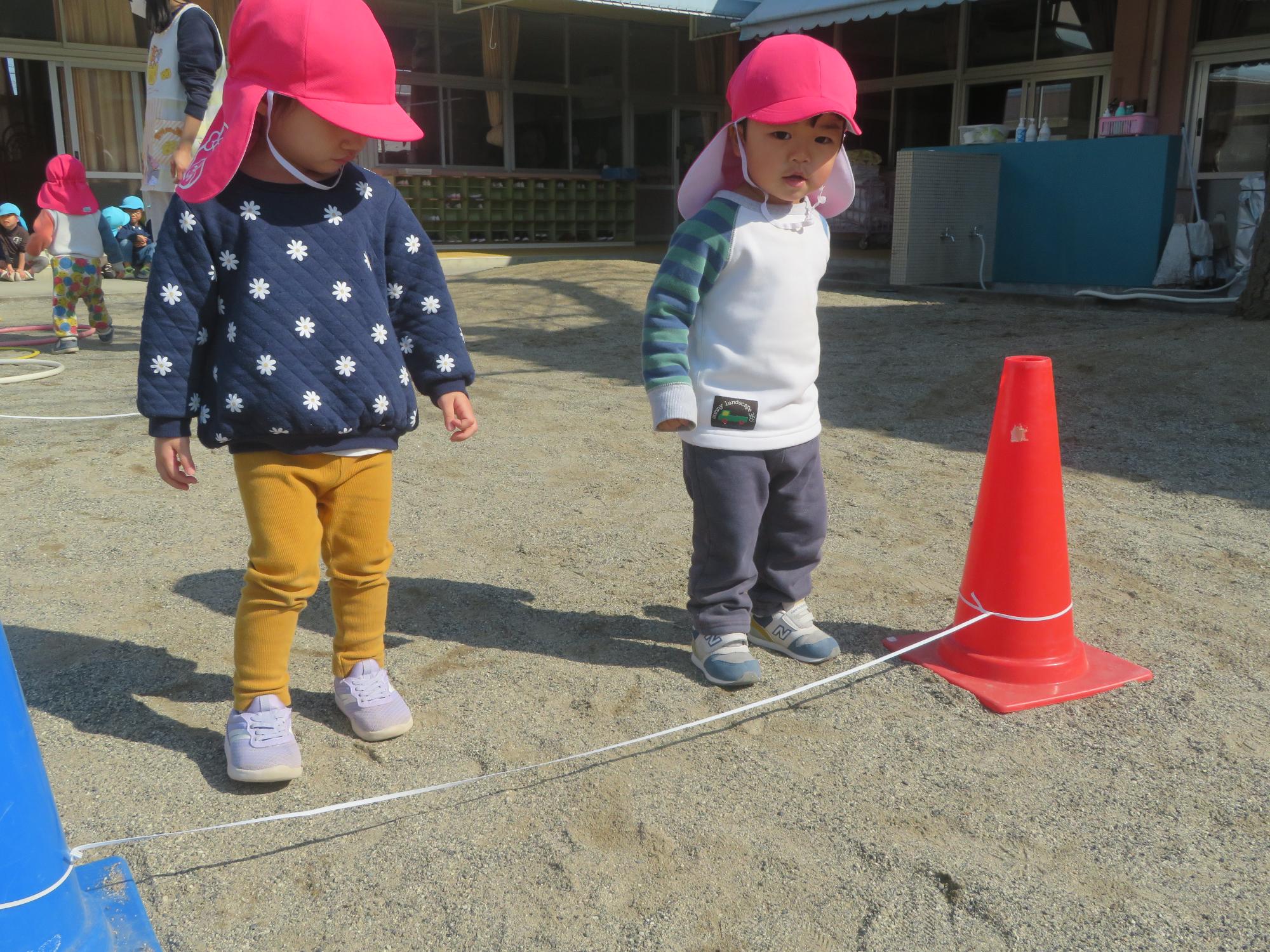 未満児さんも縄遊び会に参加しました。けんけんぱや縄を飛び越える遊びで、楽しんでいました。