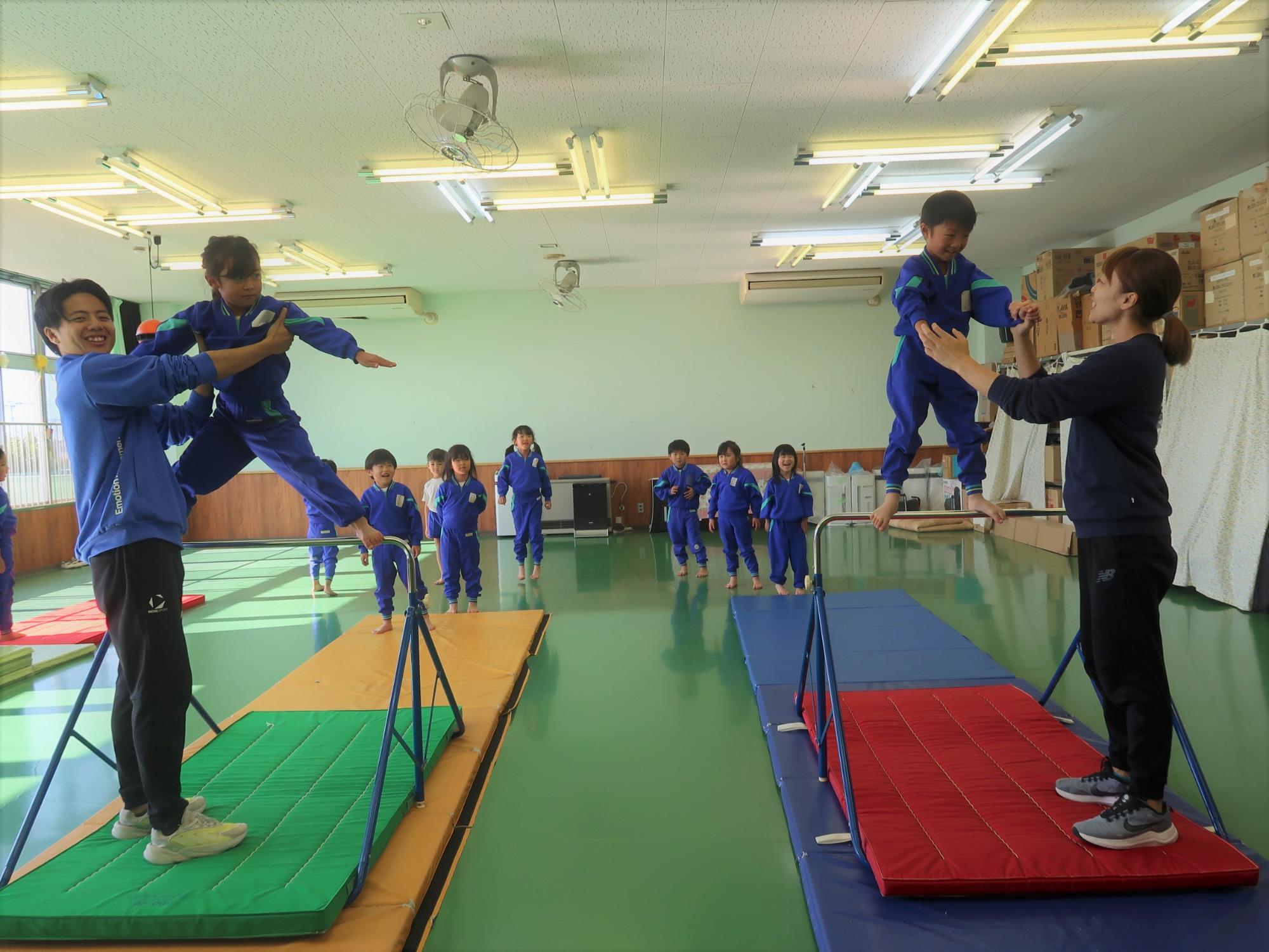 運動あそび教室では鉄棒をがんばっています。支えられながら鉄棒の上でポーズ!バランスも上手に取れるようになってきました。