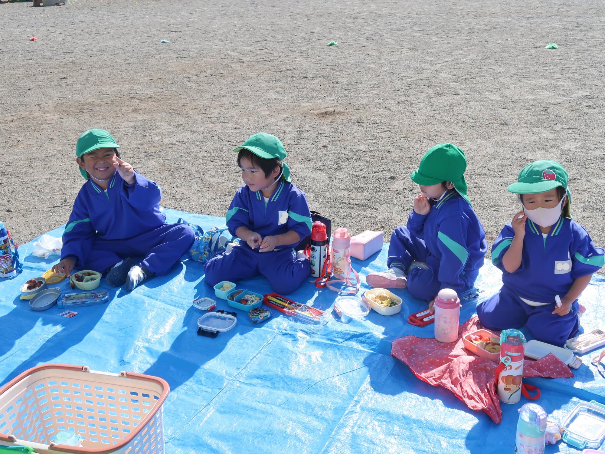 うさぎ組さんは手作り弁当を園庭で食べました。朝からお弁当の時間を楽しみにしていたのでみんなニコニコでした。