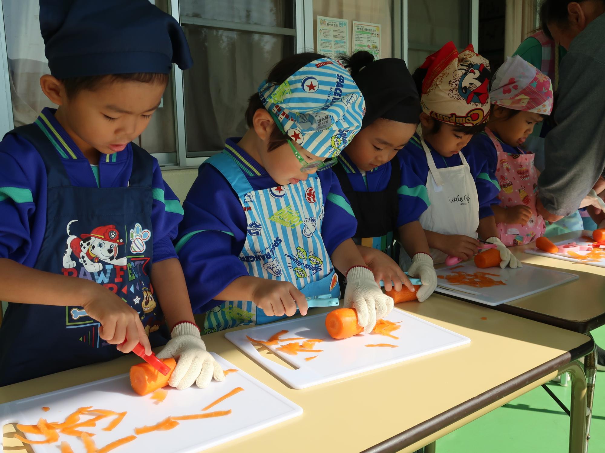 収穫祭をしました。年中さんはピーラーで野菜の皮むきをしました。いつになく真剣な表情でがんばっています。
