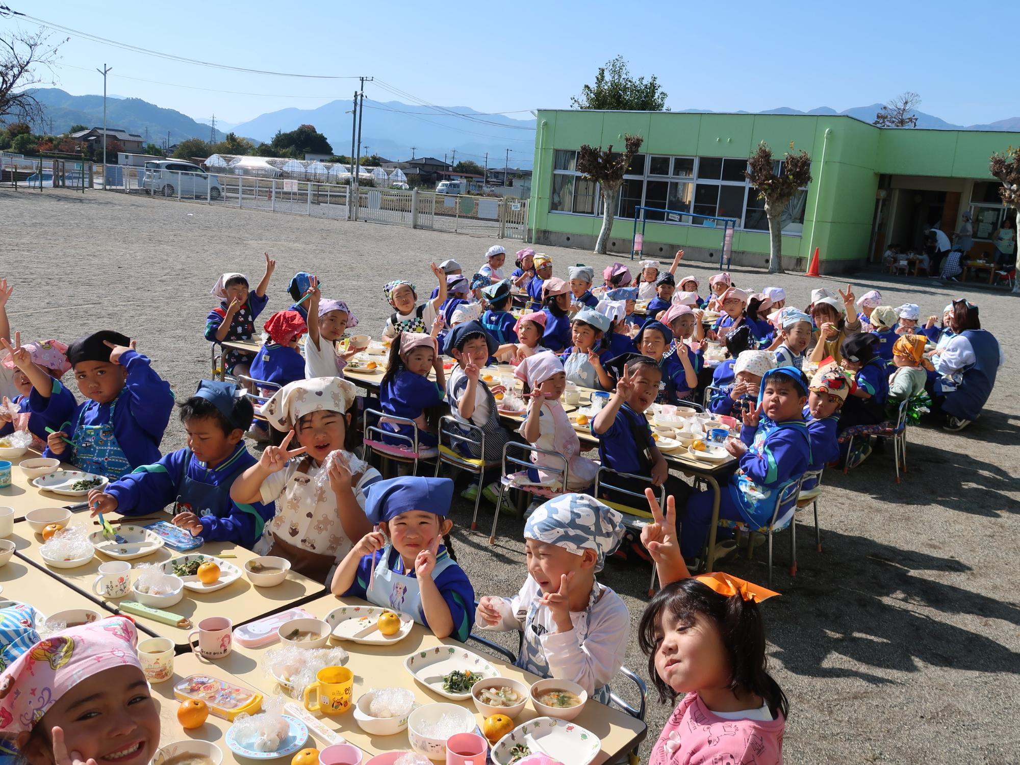 年長さんが収穫したお米で作ったおにぎりや、みんなで下ごしらえした豚汁を園庭でおいしく食べました。