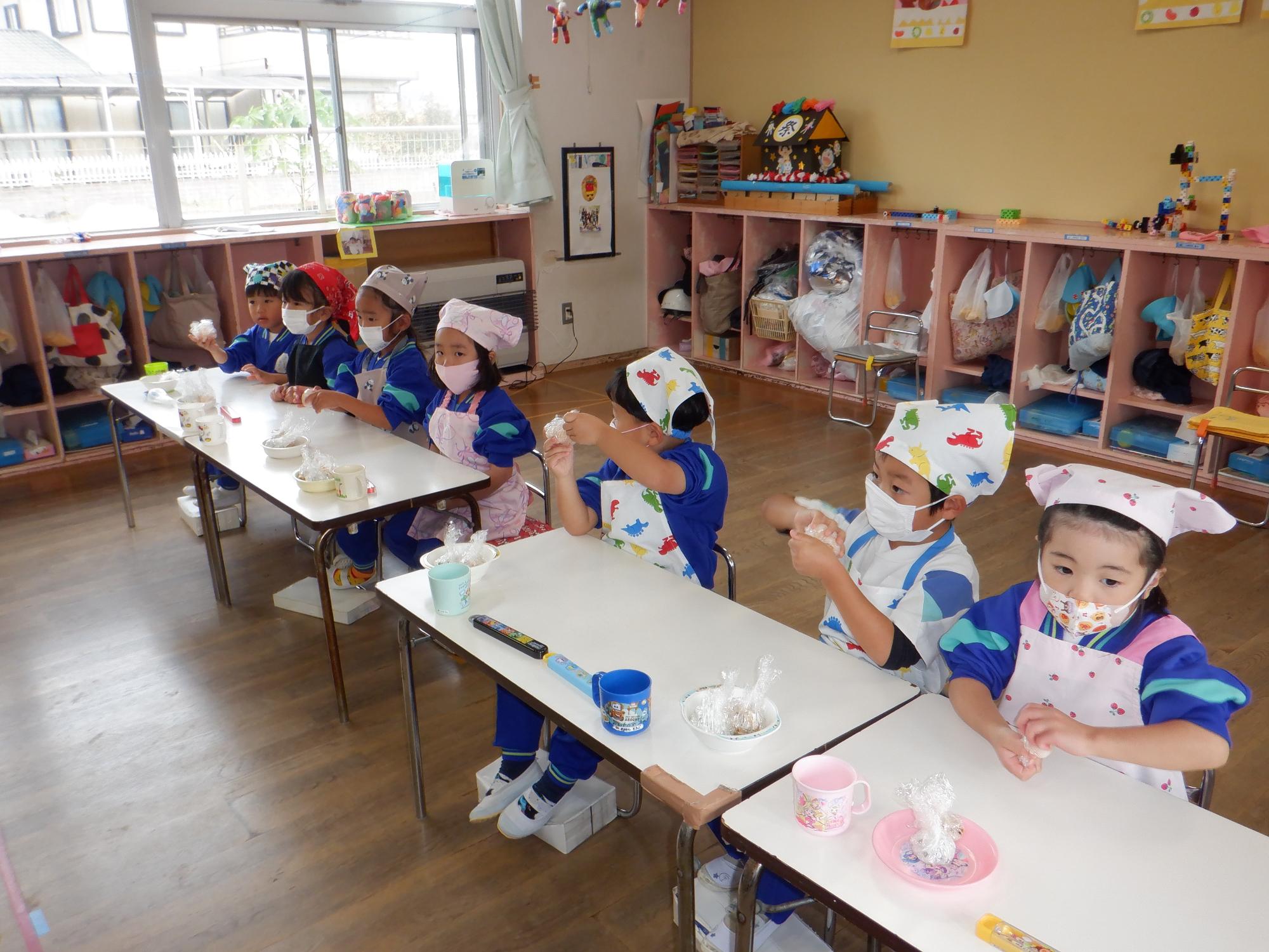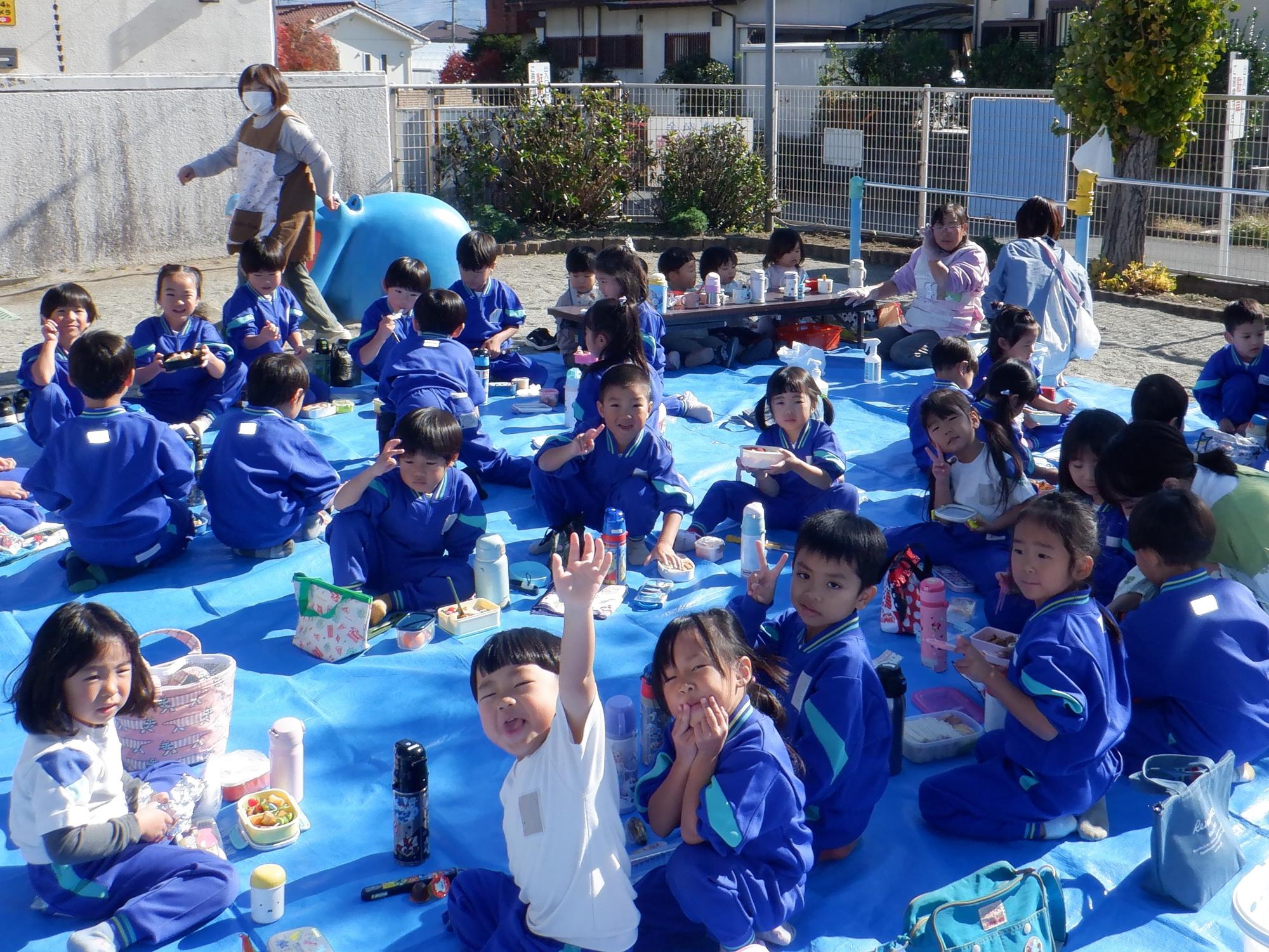 園庭で取れた野菜や年長児が収穫したお米を使って収穫祭をしました。自分で握ったおにぎりはとても美味しかったようです。