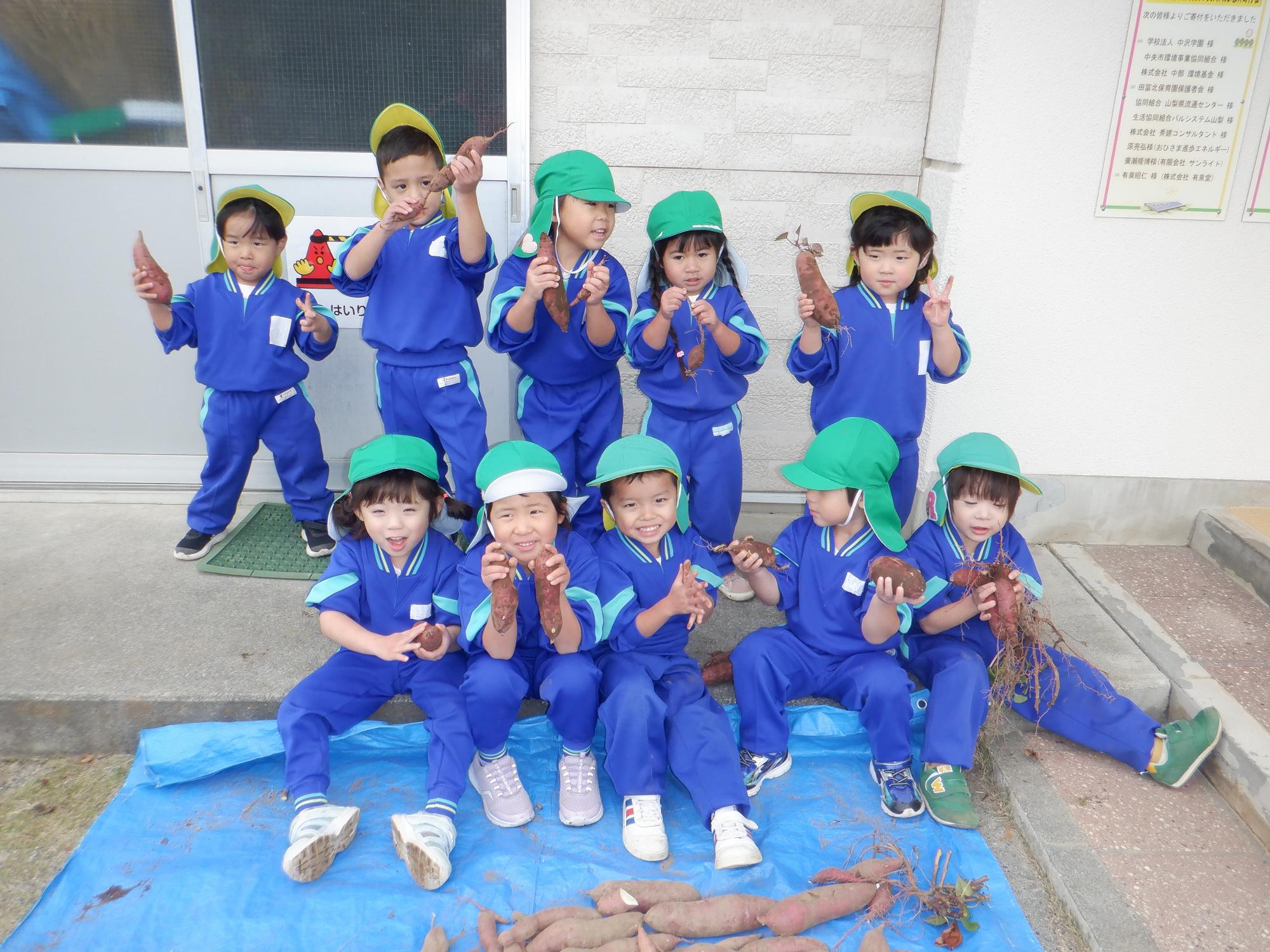 園庭の畑でさつまいも掘りをしました。土の中に潜っているさつまいもを見つけると大興奮の年少さんでした。