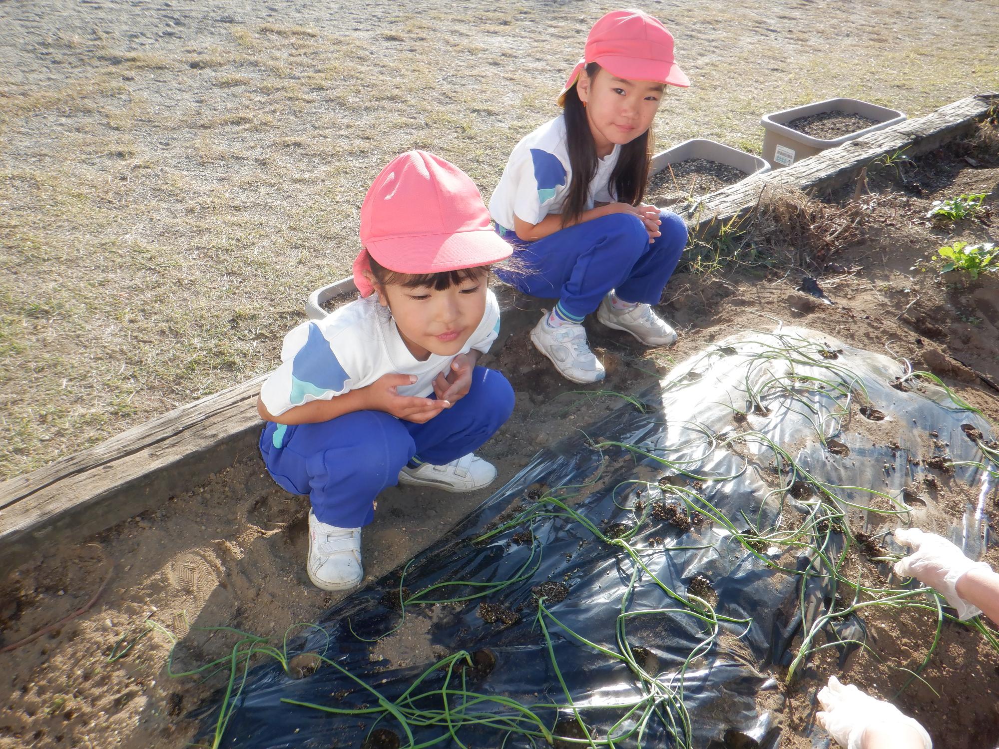 年長さんが玉ねぎの苗を植えてくれました。収穫できる頃にはみんなキラキラの小学生です。