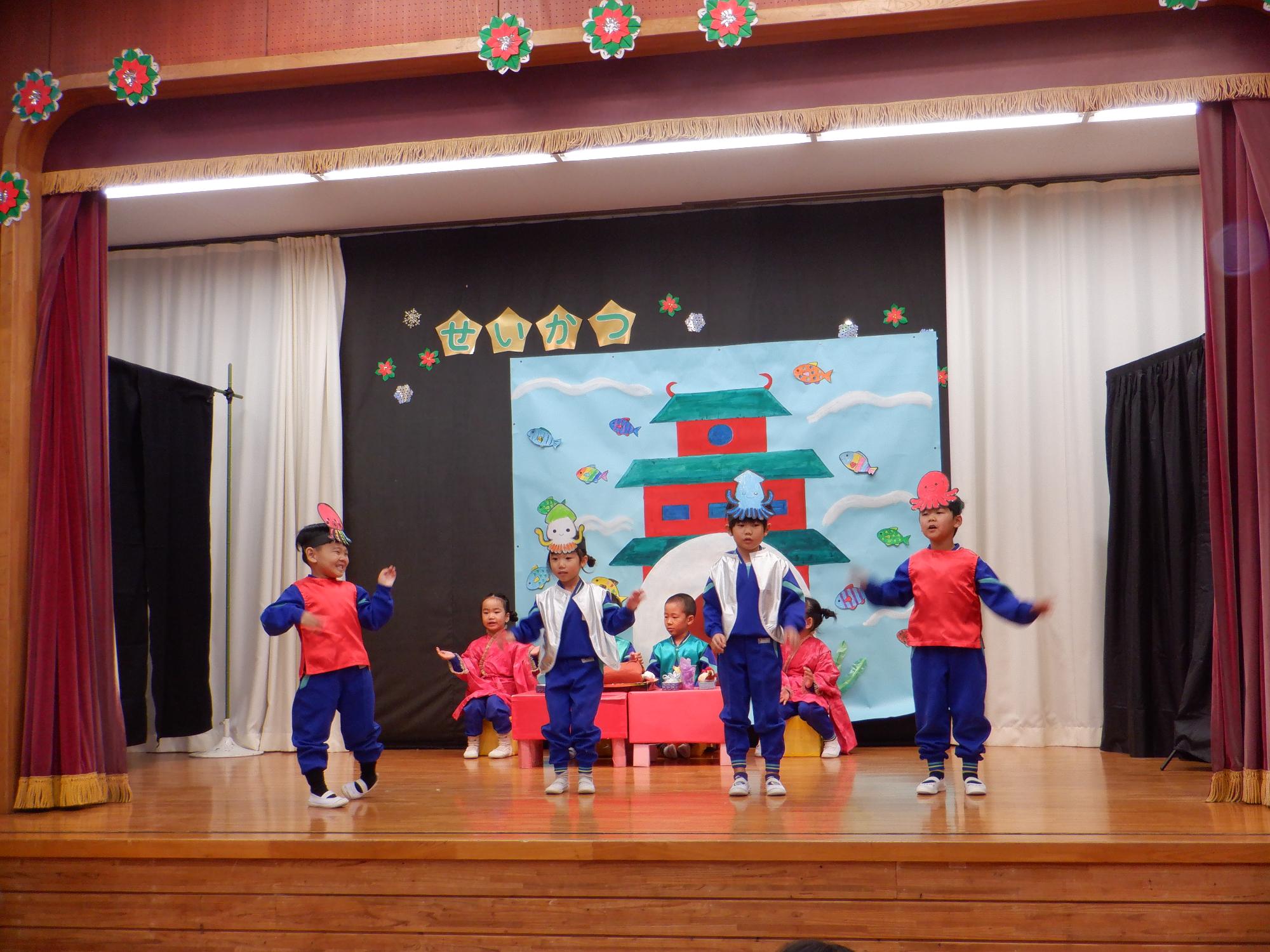 取りを飾るのは年長さんです。「うらしまたろう」のオペレッタをしました。一人ひとりセリフを覚えて演技も上手でした。