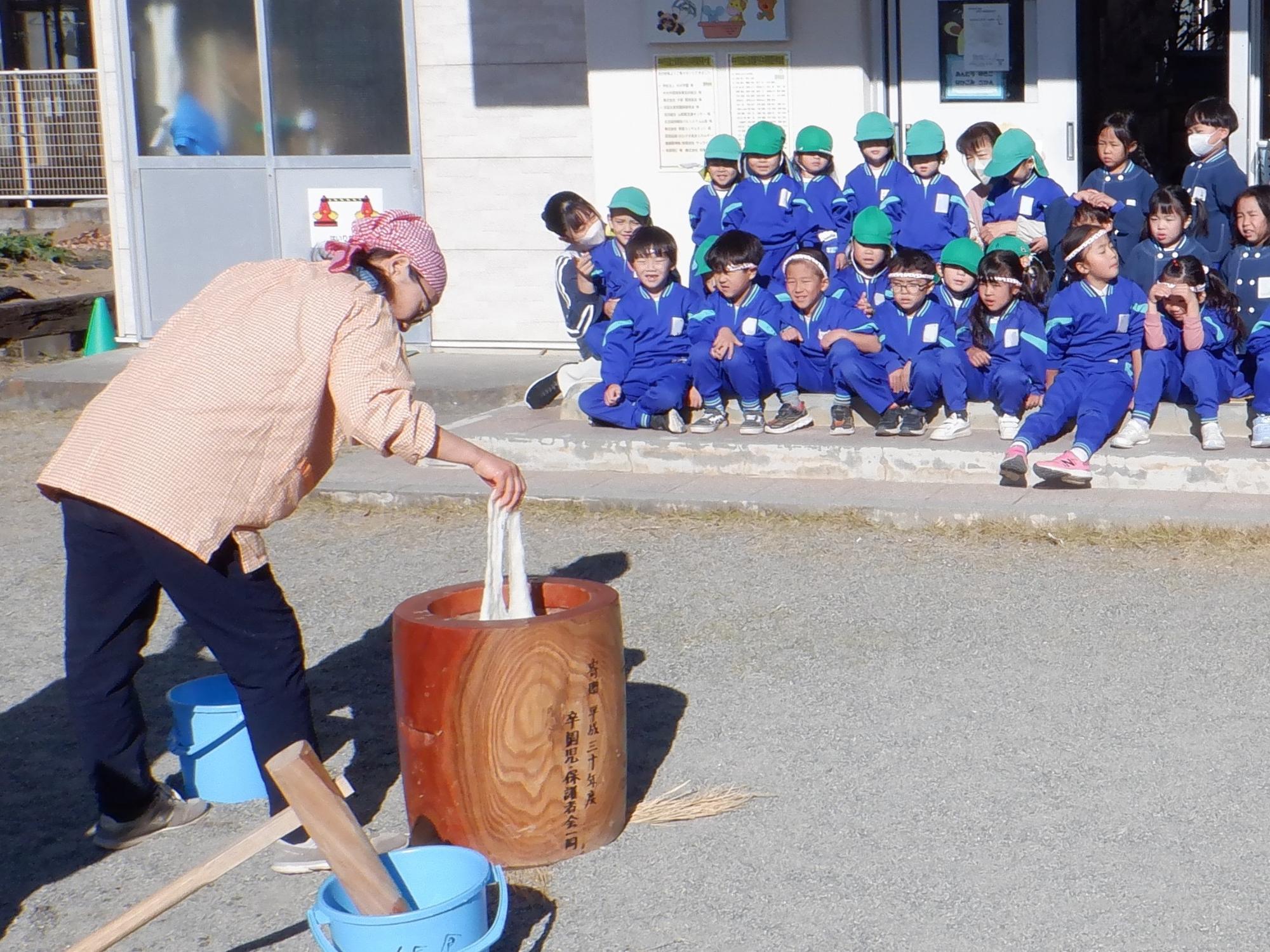 年長さんがお餅をついてお正月の鏡餅を作りました。つきあがり、伸びたお餅を見ると歓声が上がりました。