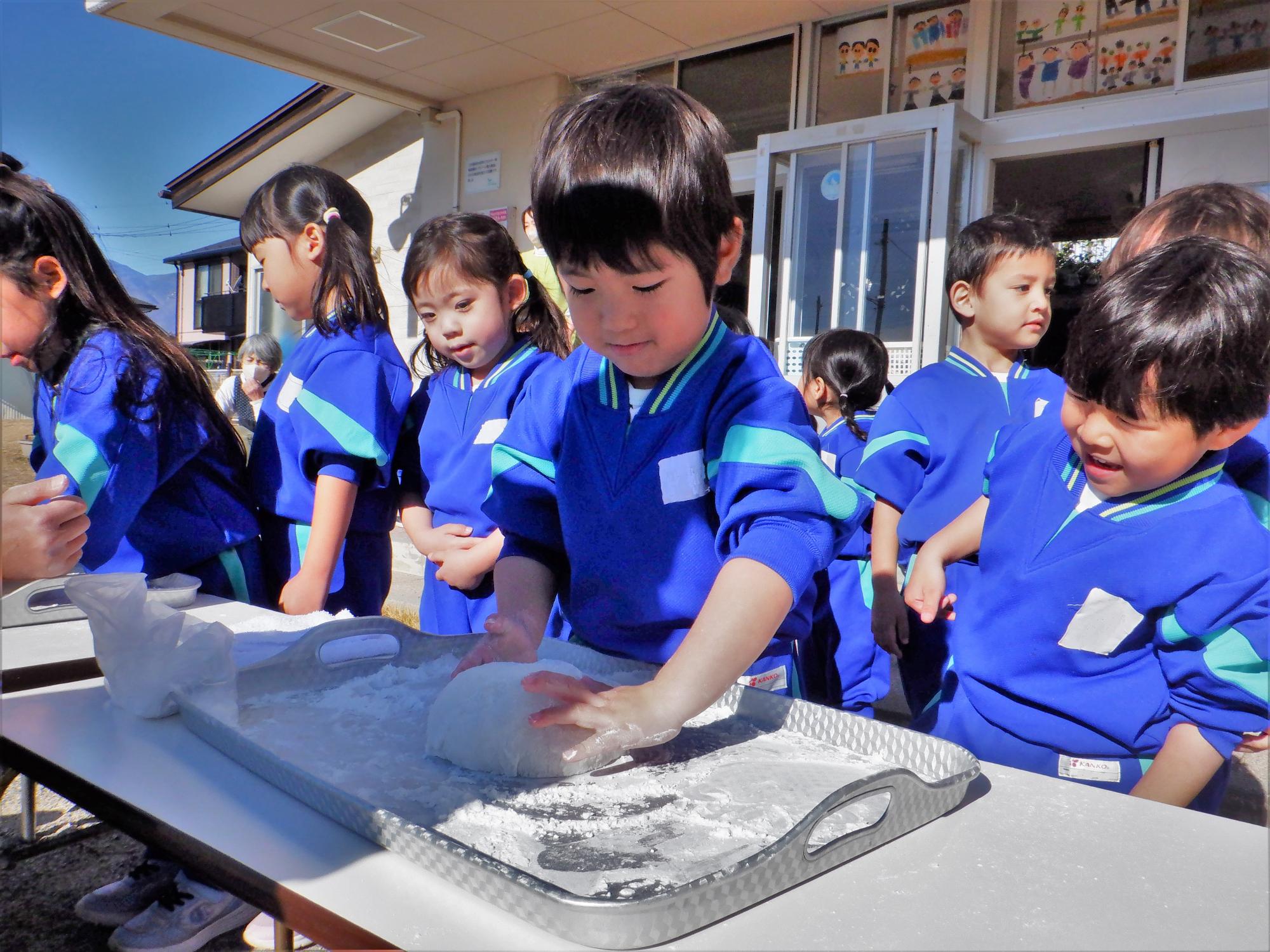 鏡餅作りでは年中・年少さんもお餅に触れてみました。目を丸くしながら「やわらかい」と感触を楽しみました。