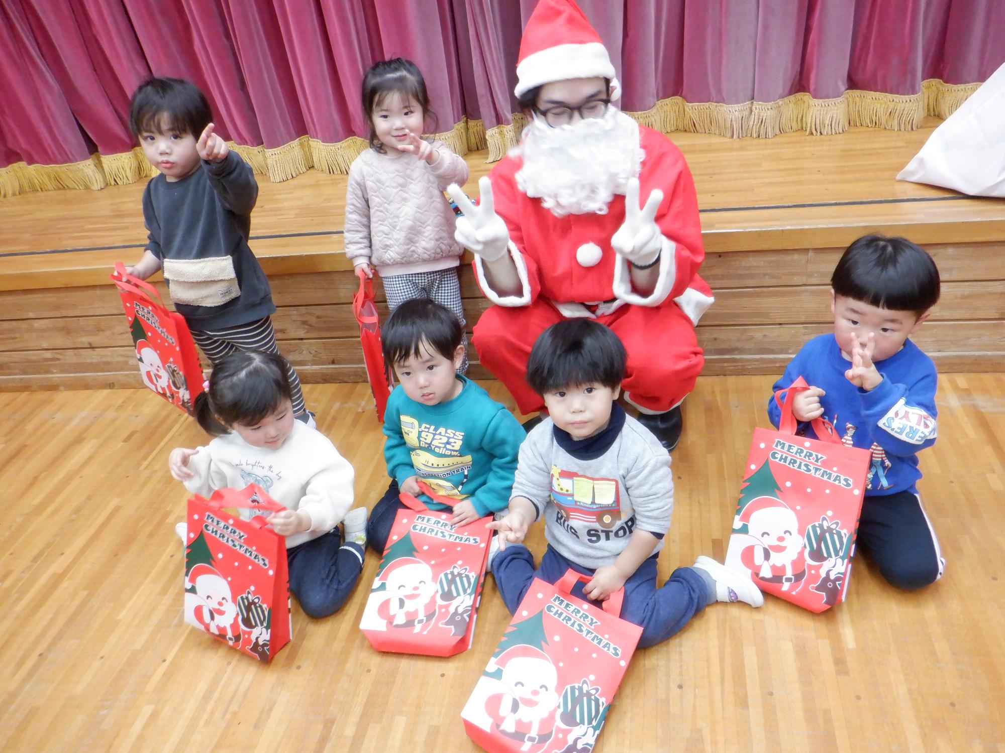 クリスマス会では近くの施設のお年寄りと交流をしながら手品や合奏を楽しみました。サンタさんも登場して子どもたちは大喜びでした。