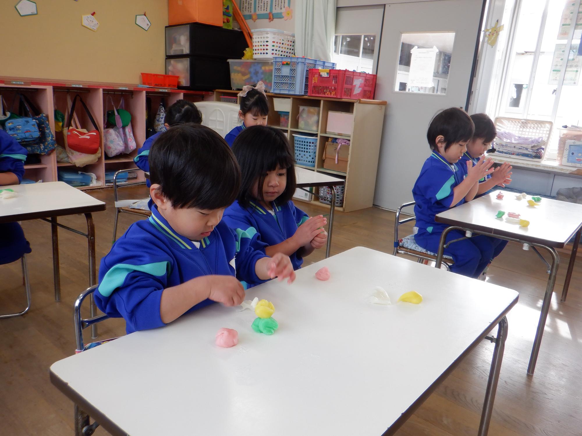 小正月のまゆ玉作りをしました。3歳児さんもかわいい手の上で生地を丸めて一生懸命4色のまゆ玉を作っていました。