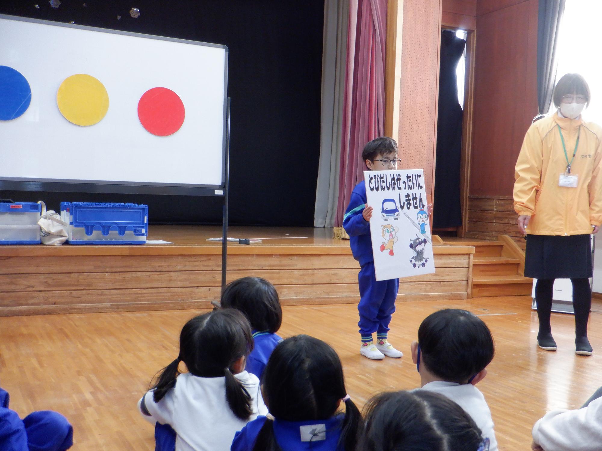 室内交通安全教室に参加しました。年長児さんはあと少しで一年生。命を守るお約束!交通ルールを忘れないでね。