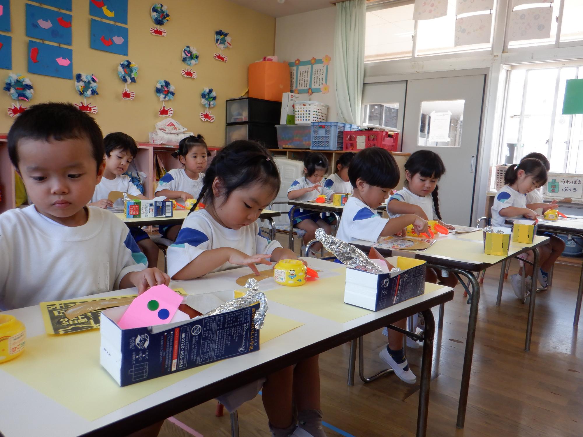年少児の折り紙製作です。進級した頃よりも折り紙の折り方やのりの付け方がとても上手になりました。