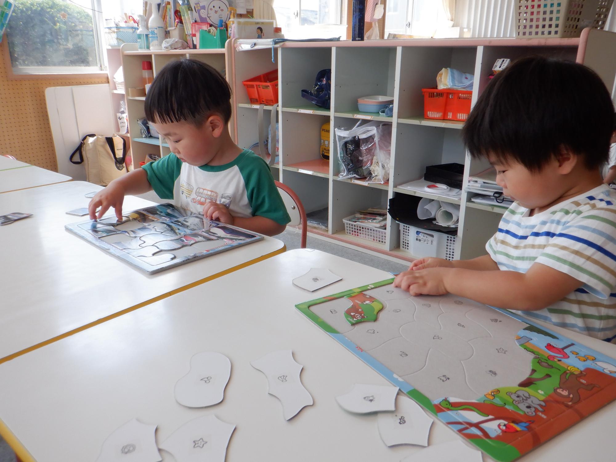 2才児さんはジグソーパズルに挑戦です。真剣な表情で一生懸命考えていました。最後までできたよ!