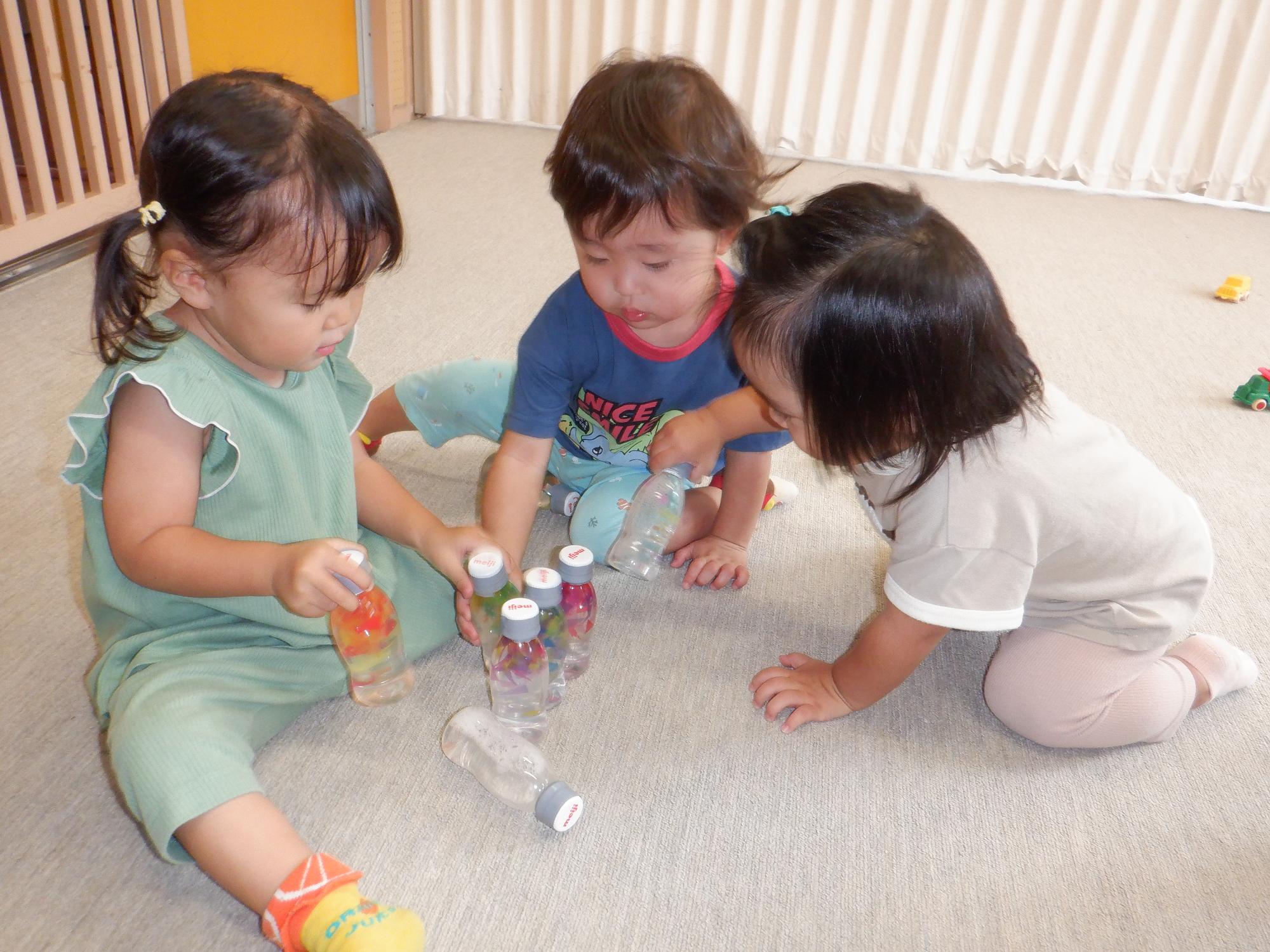 1才児は手作りおもちゃで遊んでいます。キラキラのアクアリウムを覗き込んだり並べたりして楽しんでいました。