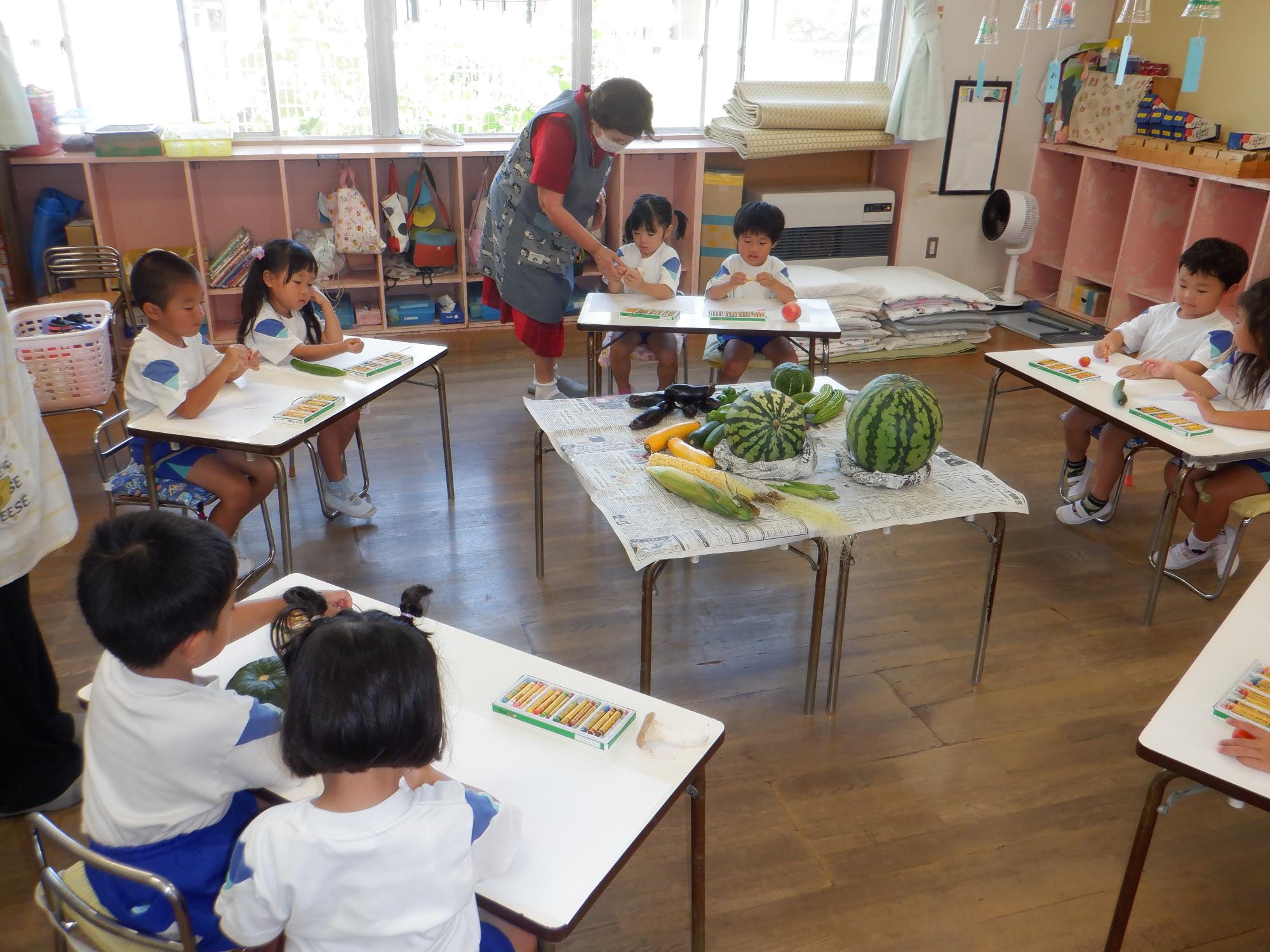 実際に野菜を手に取り、視覚だけでなく触覚や嗅覚などいろんな感覚を使って描くととても上手に描くことができました。