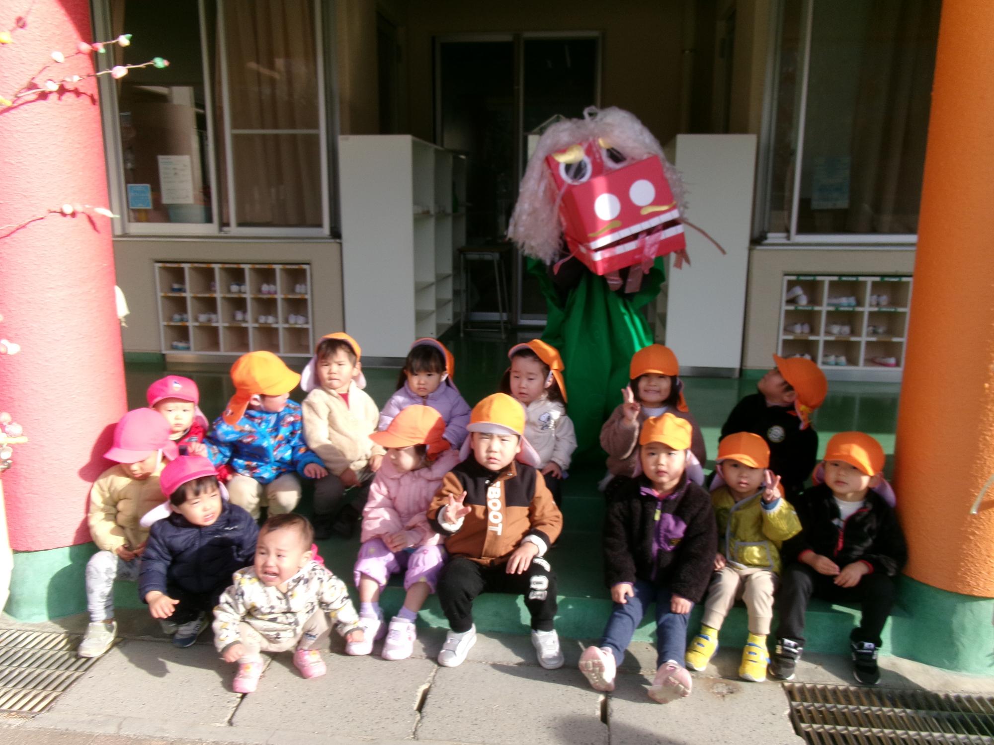 獅子舞が少しこわかった様子のりす1、2組さんですが、邪気を祓ってもらうことができました。