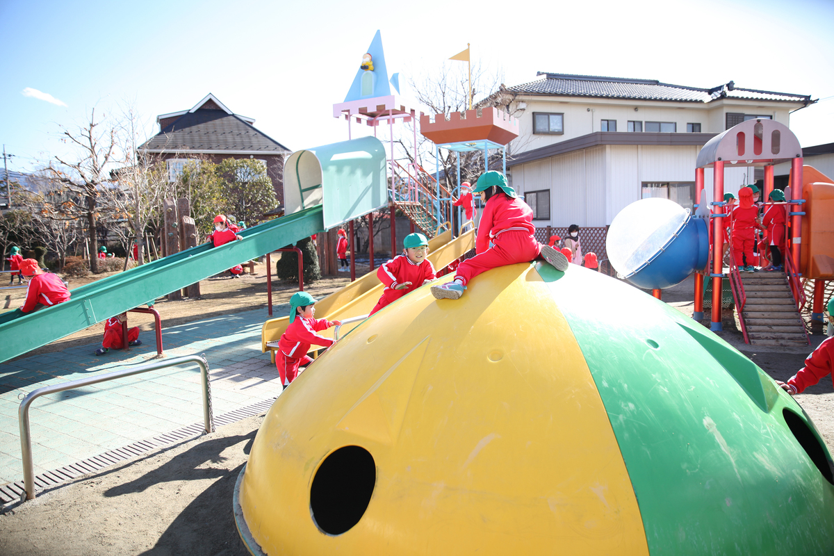 園庭にはカラフルなたくさんの遊具、ビオトープや畑もあります。四季の移ろいや小さな生き物の息づかいを感じられるのが特徴。