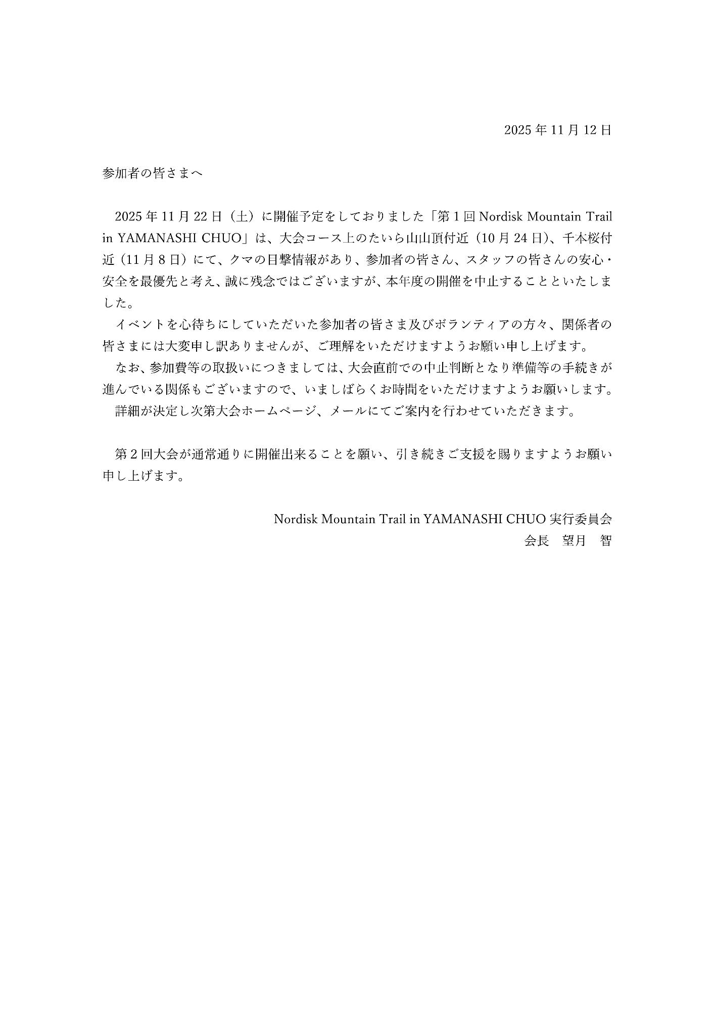 第1回Nordisk Mountain Trail in YAMANASHI CHUO開催中止について